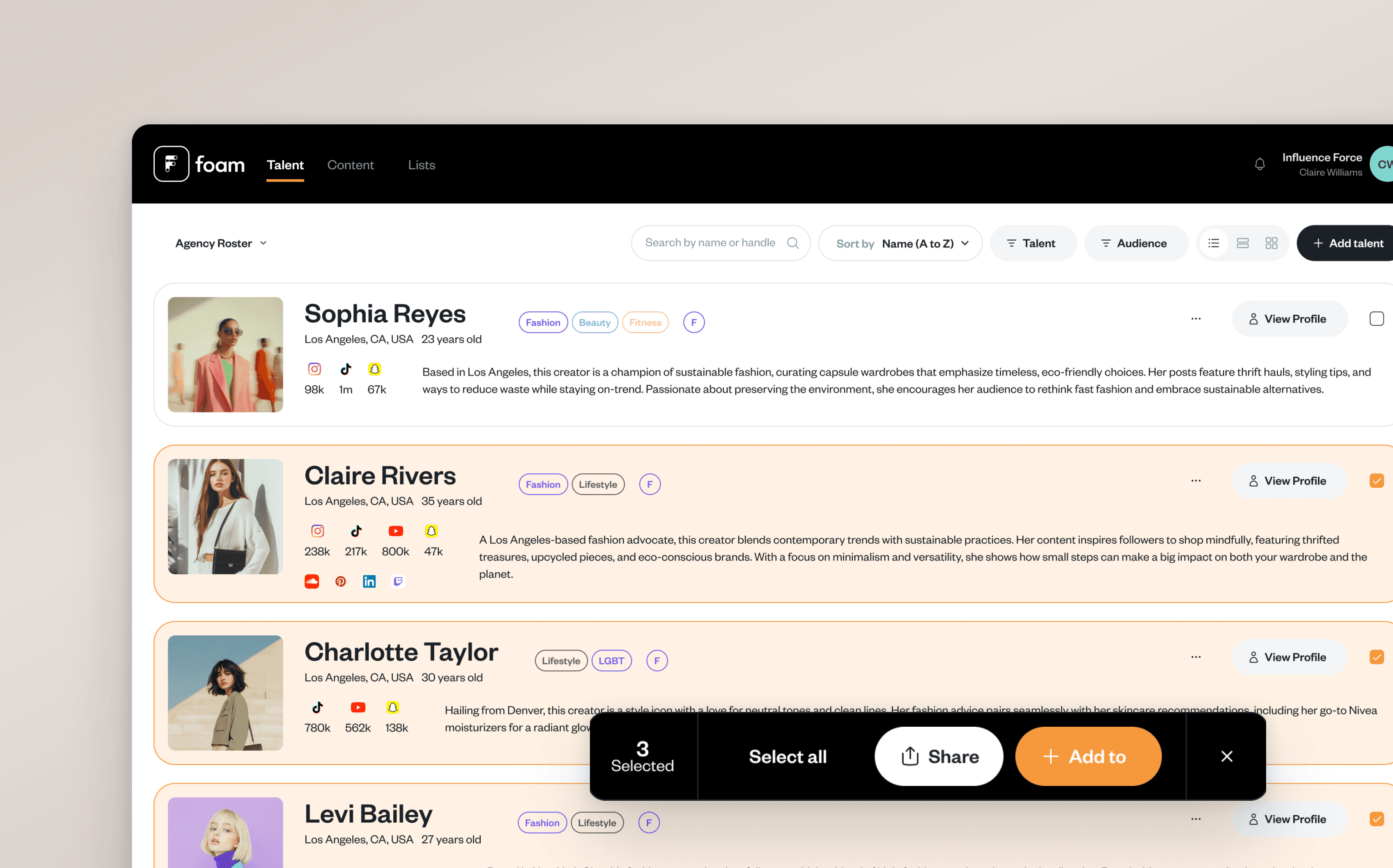Managing multiple creators is more efficient with our updated floating bar. When you select any talent, the floating bar will now appear, allowing you to easily select all your talent, share their profile, or add them to a playlist with just a few clicks.